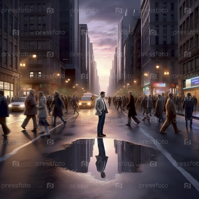 Крылья отражаются в луже у ног прохожих, которые их не видят, Ai generated image