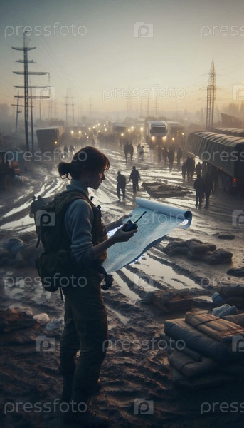 Более широкий кинематографический снимок окружающей среды, сделанный в хаотичной грязной местности для оказания помощи пострадавшим от стихийных бедствий на рассвете, Ai generated image