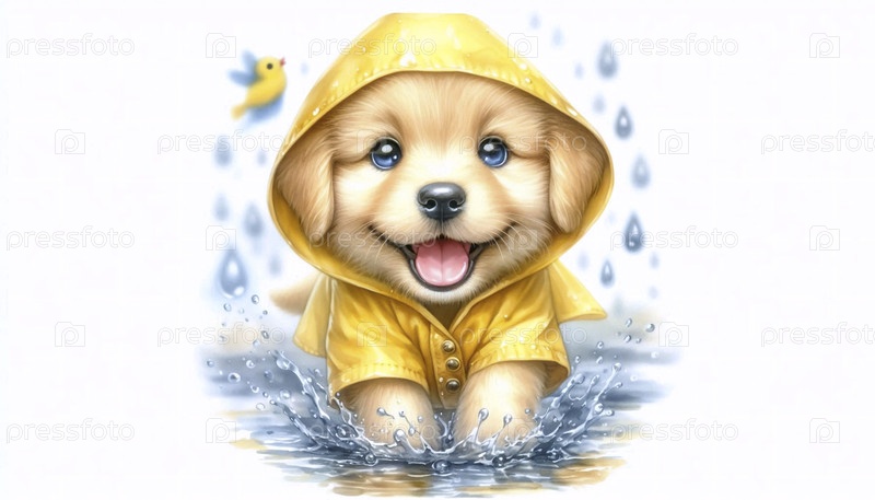 Щенок в дождевом пальто акварельный арт-принт, Ai generated image