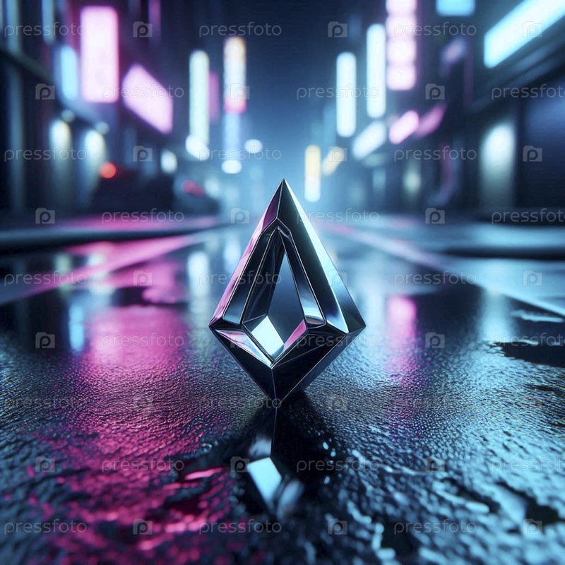 Чистый геометрический макет залога на подвеске, лежащий на дождливом черном асфальте под неоновыми знаками в темной аллее, Ai generated image