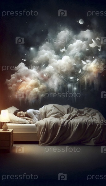 Облако снов, плавающее над спящей женщиной, Ai generated image