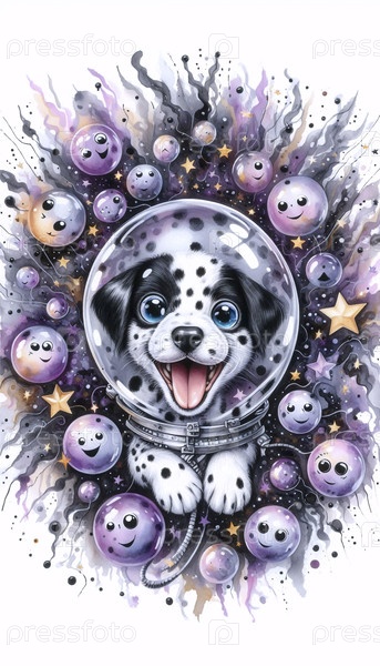 Щенок в космическом корабле акварельный художественный печат, Ai generated image