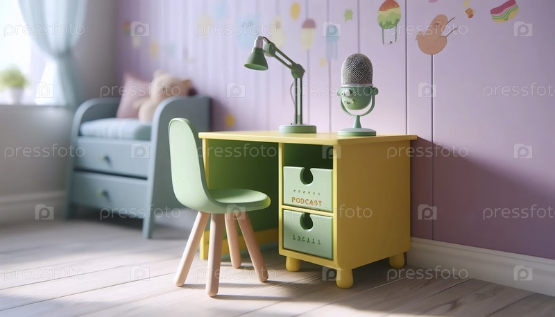 Небольшой красочный макет рабочего стола со встроенными шкафами для хранения и крошечным пустым микрофоном на низком стенде, в игровой комнате Ai создал изображение