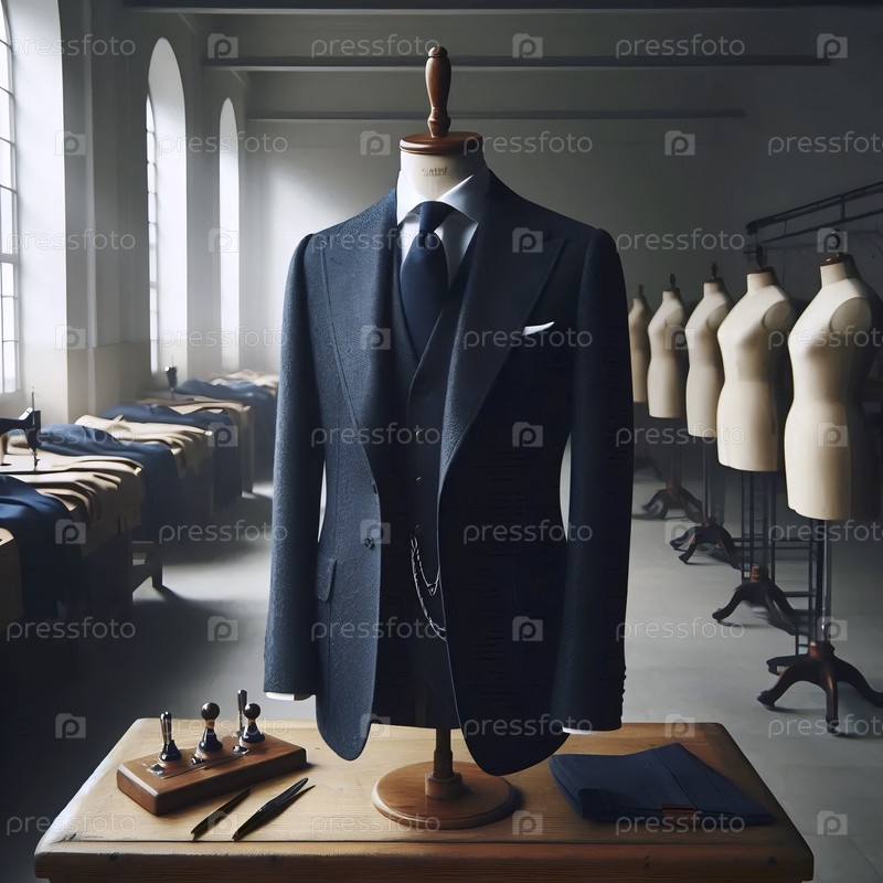 Классический макет трехкомпонентного костюма из военно-морской шерсти, расположенный на манекену портного, Ai generated image