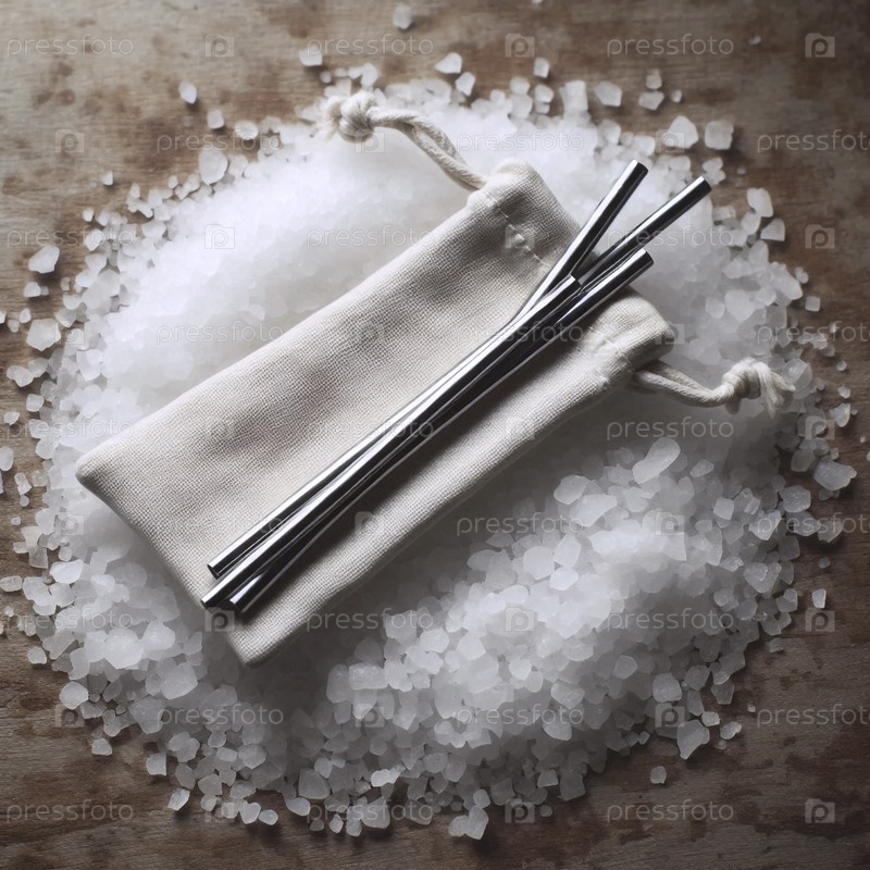 Мокет соломы из нержавеющей стали, спрятанный внутри небольшого льняного мешка с резьбой на веревке, на кровати морской соли, Ай создал изображение