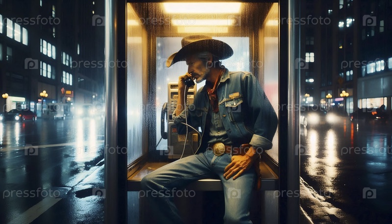 Ковбой в неоновой телефонной будке, Ai generated image