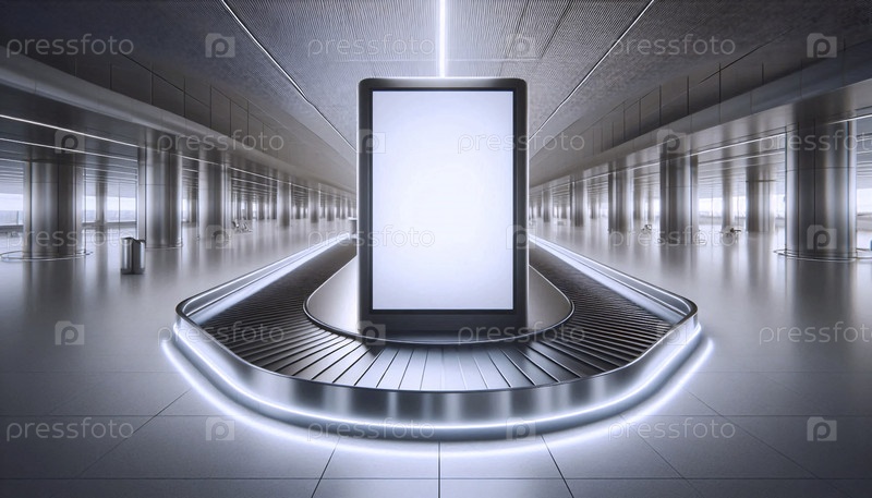 Выгнутый панорамный рекламный макет-панел расположен над пустой багажной каруселью аэропорта, Ai generated image