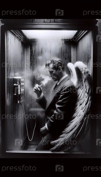 Ангел зажигает сигарету в телефонной будке, сжатые крылья, Ai generated image