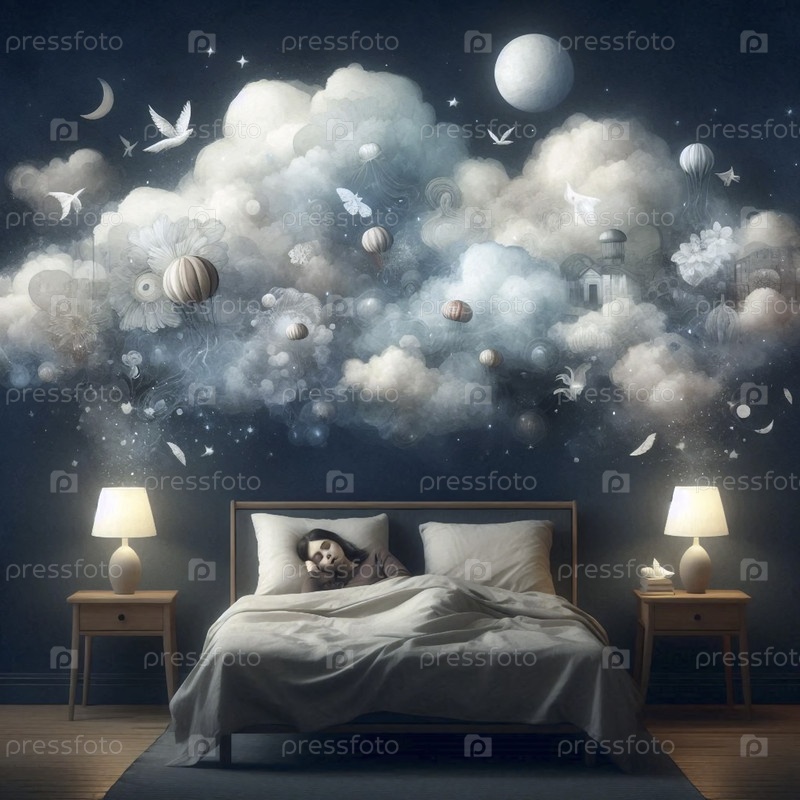 Облако снов, плавающее над спящей женщиной, Ai generated image