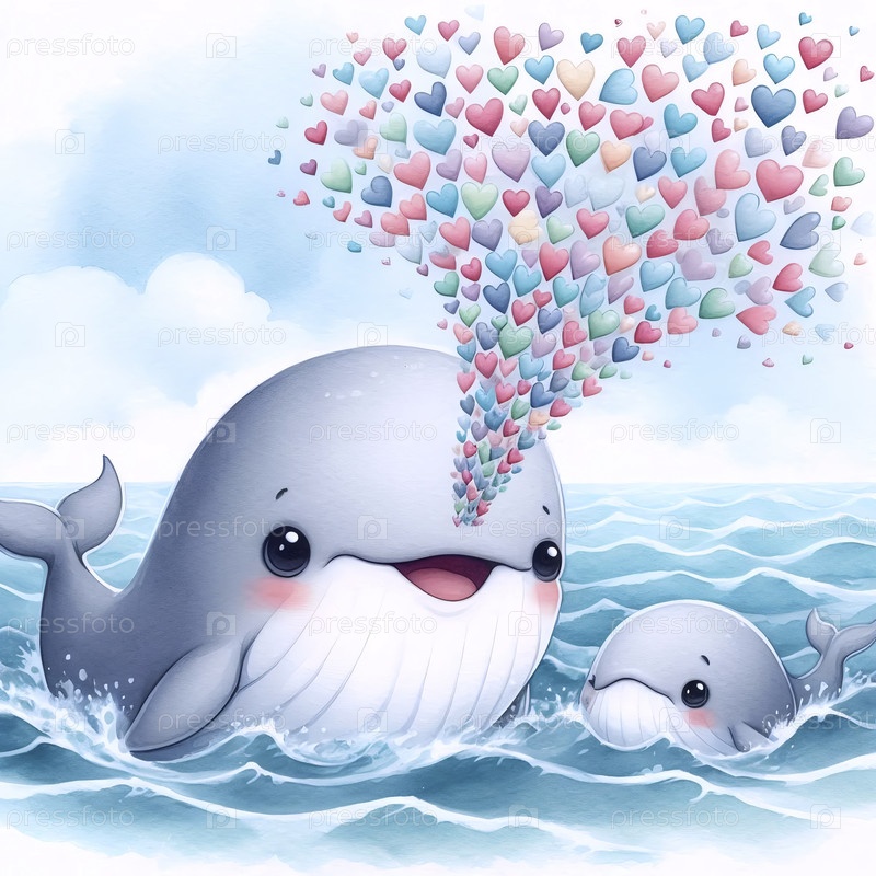 Little Whale Spouting Hearts Акварельный художественный печат, Ai generated image