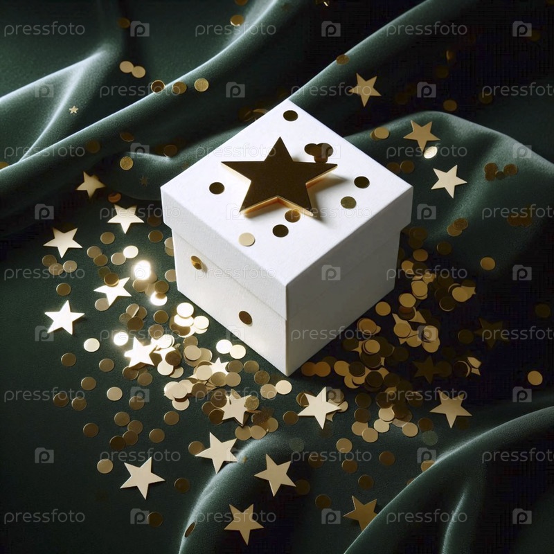 Простой белый макет подарочной коробки, посыпанный металлическими золотыми конфетками на темно-зеленом бархатном фоне, Ai generated image
