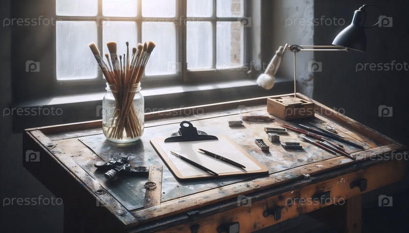 Широкий, рассыпанный краской деревянный макет чертежного стола с пустой кнопкой и чашей чистых кистей у солнечного окна Ai создал изображение