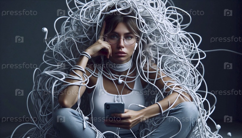 Женщина, запутавшаяся в паутине проводов для наушников, Ai generated image