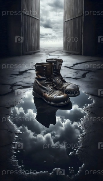 Пара изношенных рабочих сапог заполнена дождевой водой, Ai generated image