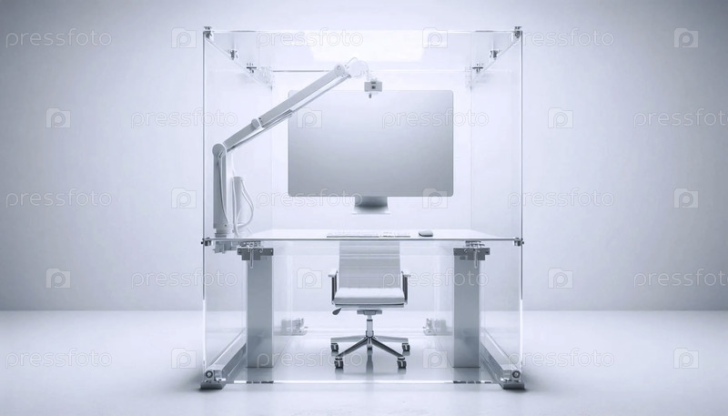 Прозрачный акриловый макет рабочего стола, плавающий в яркой комнате с одним монитором, установленным на белом рукаве против белой стены, Ai создал изображение