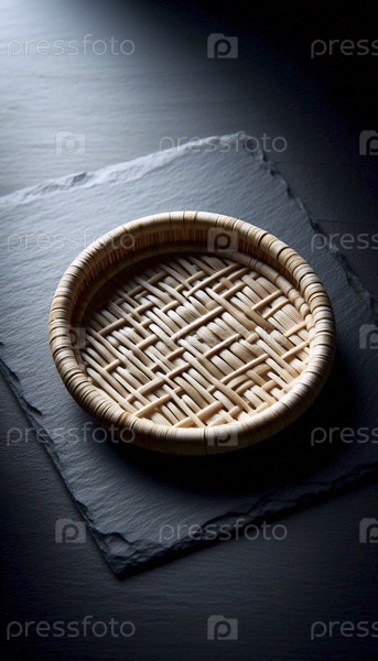 Круглый, пустой макет бамбуковой суши-платки со подставкой на палочках, на темной поверхности сланца, Ai generated image