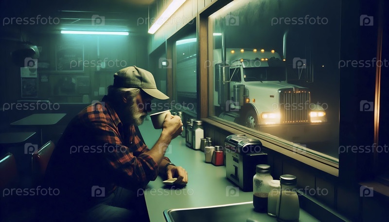 Водитель грузовика 1970-х годов в придорожной закусочной ночью, Ai generated image