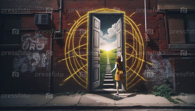 Женщина, открывающая дверь с мелом на кирпичной стене, Ai generated image