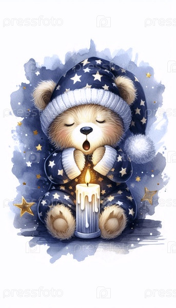 Спящий медведь в звездном ночном халате Акварельная художественная печать, Ai generated image