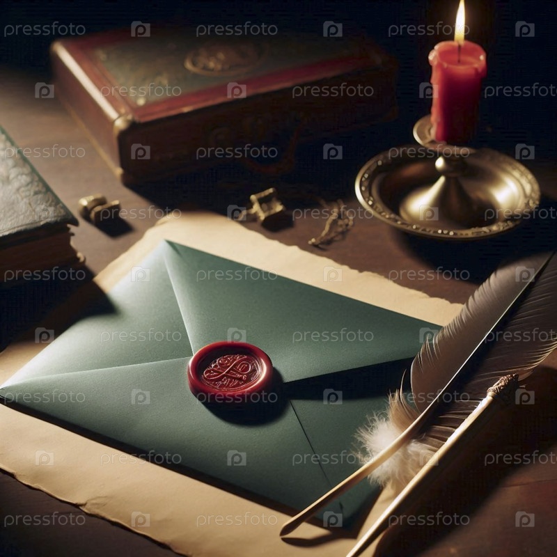 Мокет темно-зеленого конверта с пустой, красной восковой печатью на столе с пернатым песком Ai generated image
