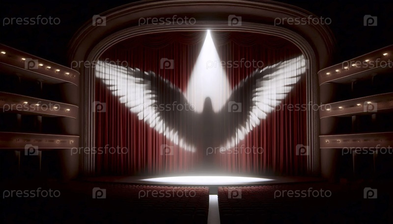 Тени ангельских крыльев на театральном занавесе, без актеров, Ai generated image