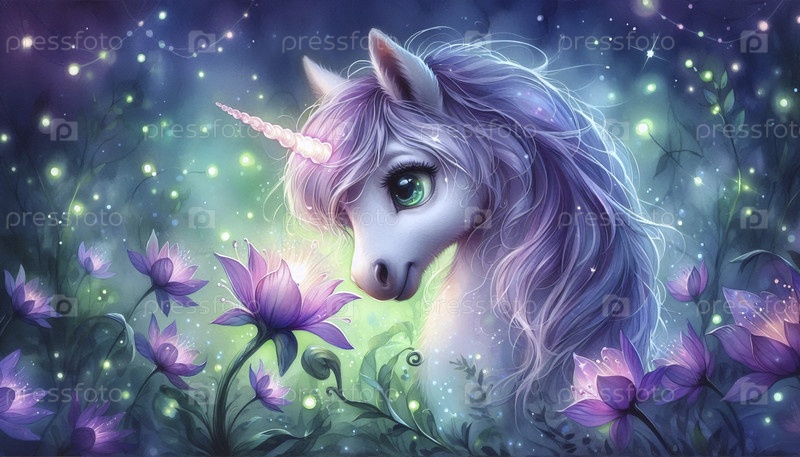 Единорог обнаруживает светящийся цветок акварельный арт-принт, Ai generated image