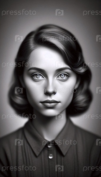 Классический, формально составленный три четверти портрет, где молодая женщина смотрит прямо вперед с нейтральным