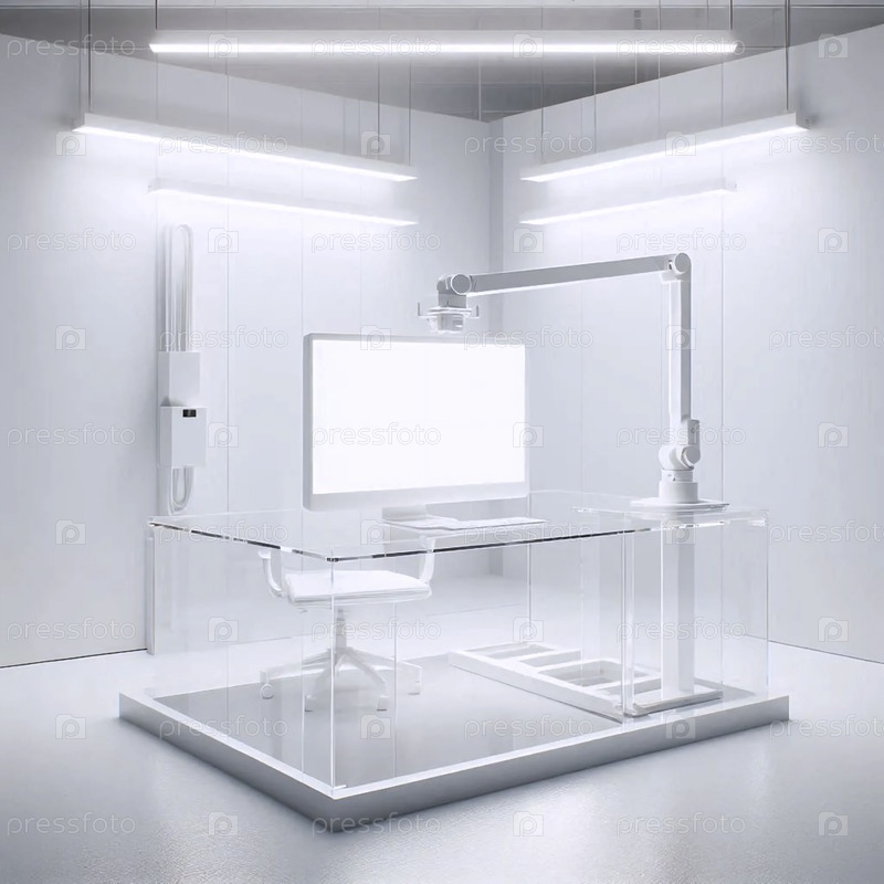 Прозрачный акриловый макет рабочего стола, плавающий в яркой комнате с одним монитором, установленным на белом рукаве против белой стены, Ai создал изображение
