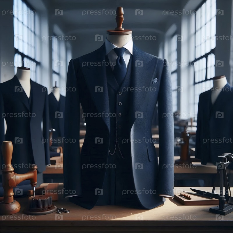 Классический макет трехкомпонентного костюма из военно-морской шерсти, расположенный на манекену портного, Ai generated image