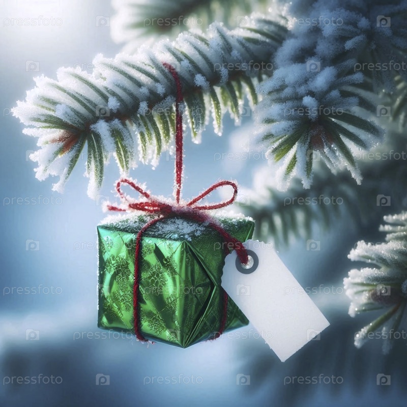 Небольшой, упакованный в фольгу подарочный макет с пустым тегом, висящий на пышной сосновой ветке, украшенный морозом, Ai generated image