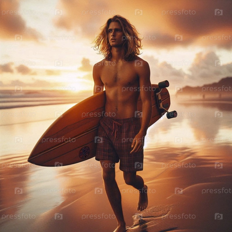 Серфер 1960-х годов при закате солнца на калифорнийском пляже, Ai generated image