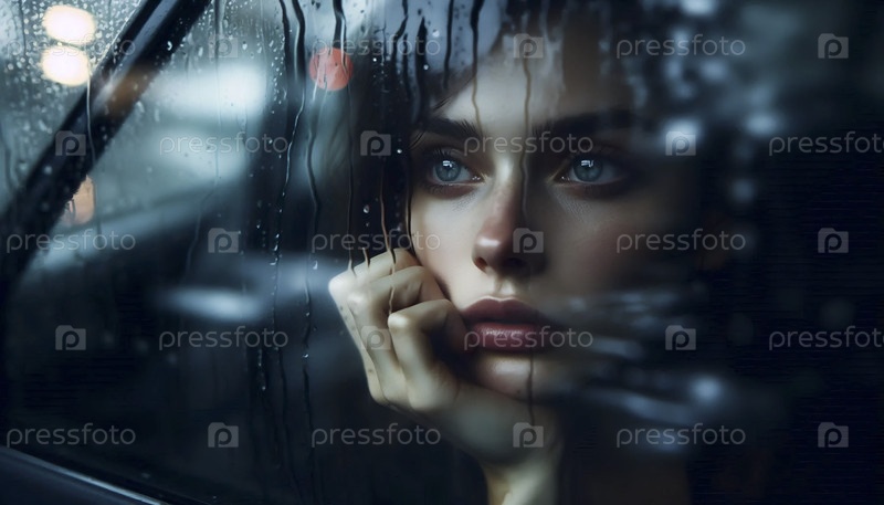 Глаза, увиденные через окно с полосками дождя, Ai generated image