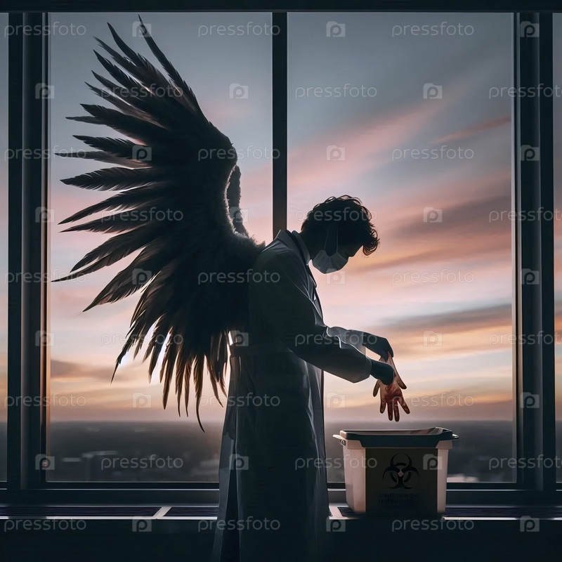 Ангел-врач в окне больницы на рассвете, избавляясь от кровавых перчаток, Ai generated image