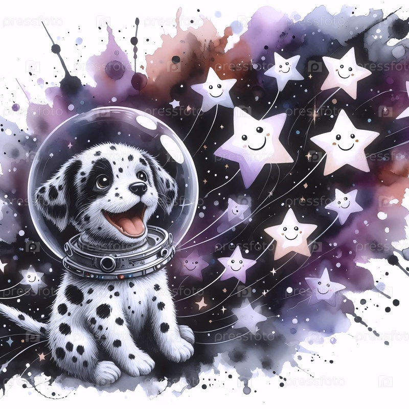 Щенок в космическом корабле акварельный художественный печат, Ai generated image