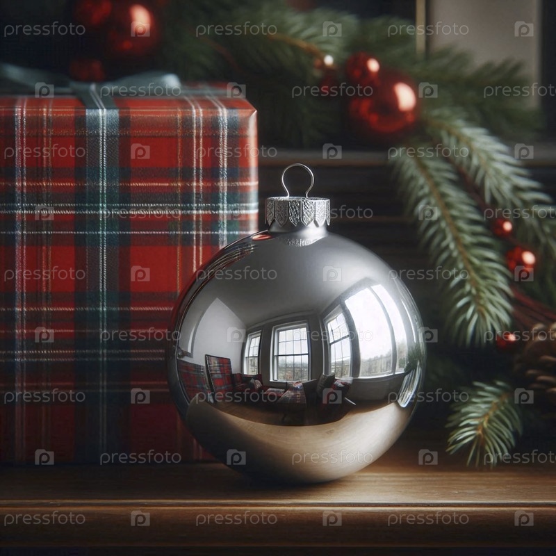 Мокет праздничного украшенияПростой, пустый стеклянный мокет расположен рядом с упакованной в тартан подарочной коробкой на камине, Ai generated image