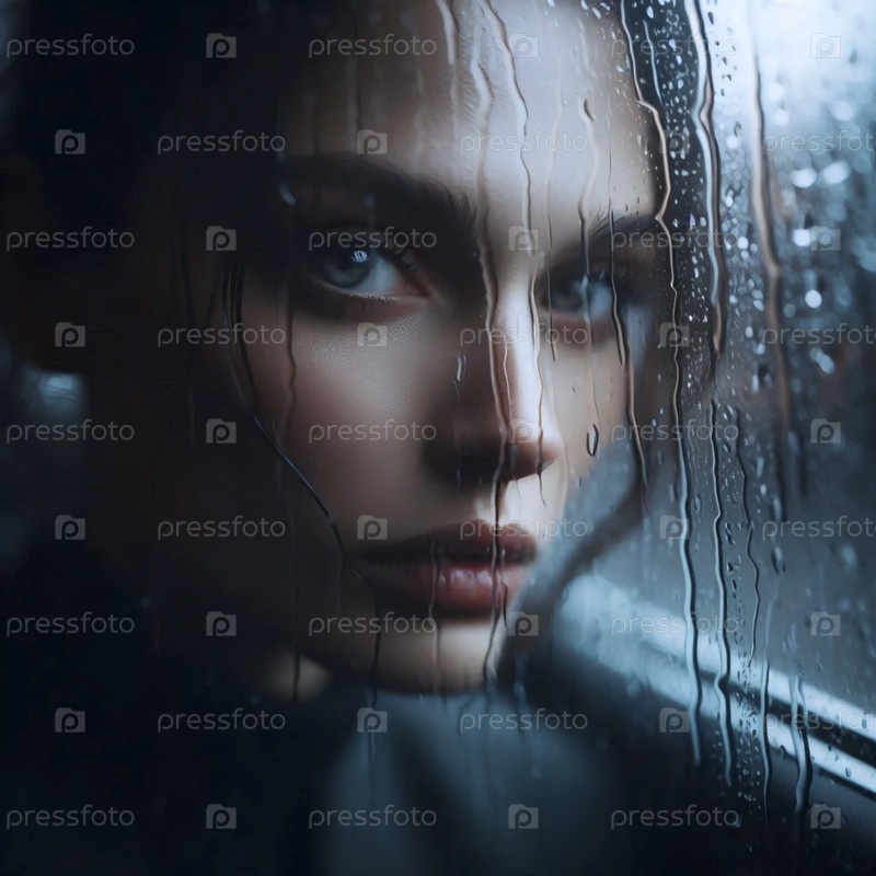 Глаза, увиденные через окно с полосками дождя, Ai generated image