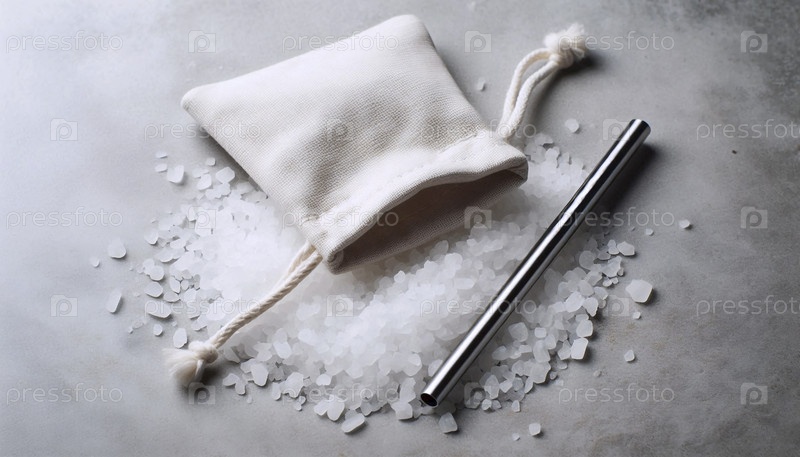 Мокет соломы из нержавеющей стали, спрятанный внутри небольшого льняного мешка с резьбой на веревке, на кровати морской соли, Ай создал изображение