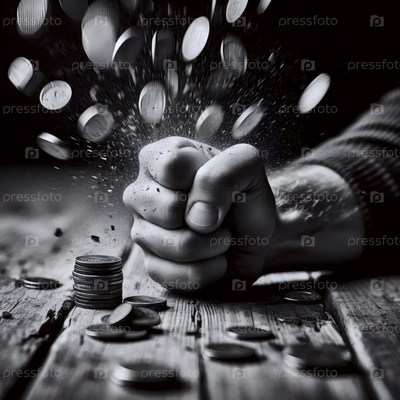 Динамический снимок руки, бьющей монеты на стол, Ai создал изображение