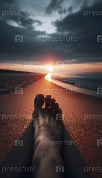 нога против пляжа захода солнца