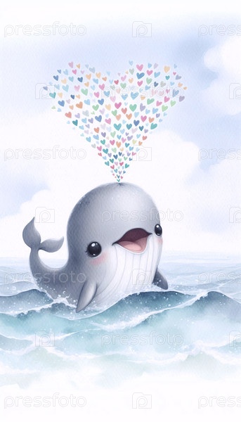 Little Whale Spouting Hearts Акварельный художественный печат, Ai generated image