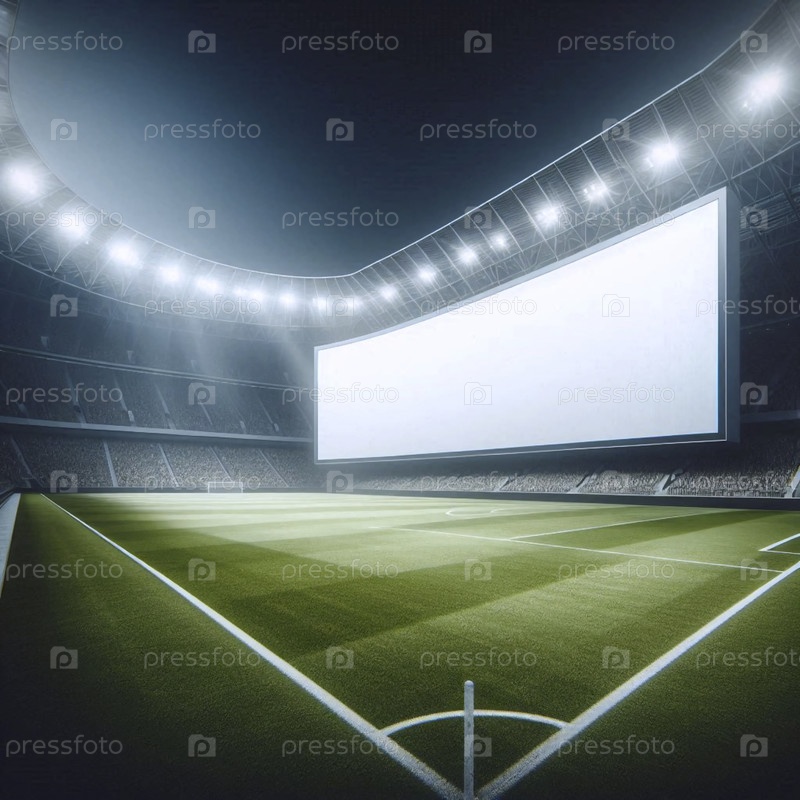 Макет рекламного щита с изогнутым периметром, пустой и не освещенный, окружающий пустое футбольное поле под светофорами стадиона, Ai generated image