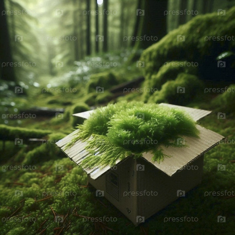 Простой макет картонной коробки с живым мхом, растущим естественным образом в одном из его влажных уголков, в затененной лесной обстановке, Ai создал образ