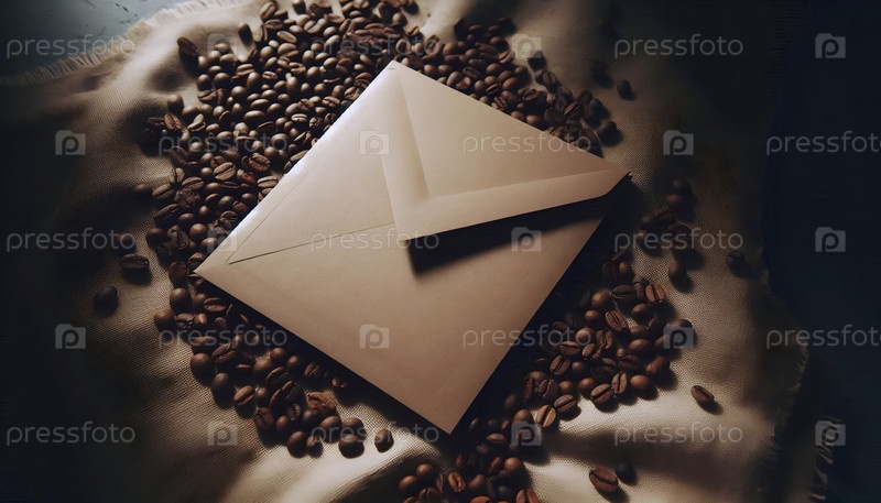 Мокет конверта из крафт-бумажной бумаги с пустым квадратом для адреса, лежащего на кровати свободных кофейных зерен, Ай создал изображение