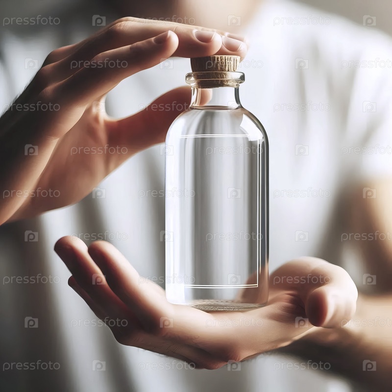 Пустой макет прямоугольной области этикеток на прозрачной стеклянной бутылке, удерживаемой в человеческой руке, Ai generated image