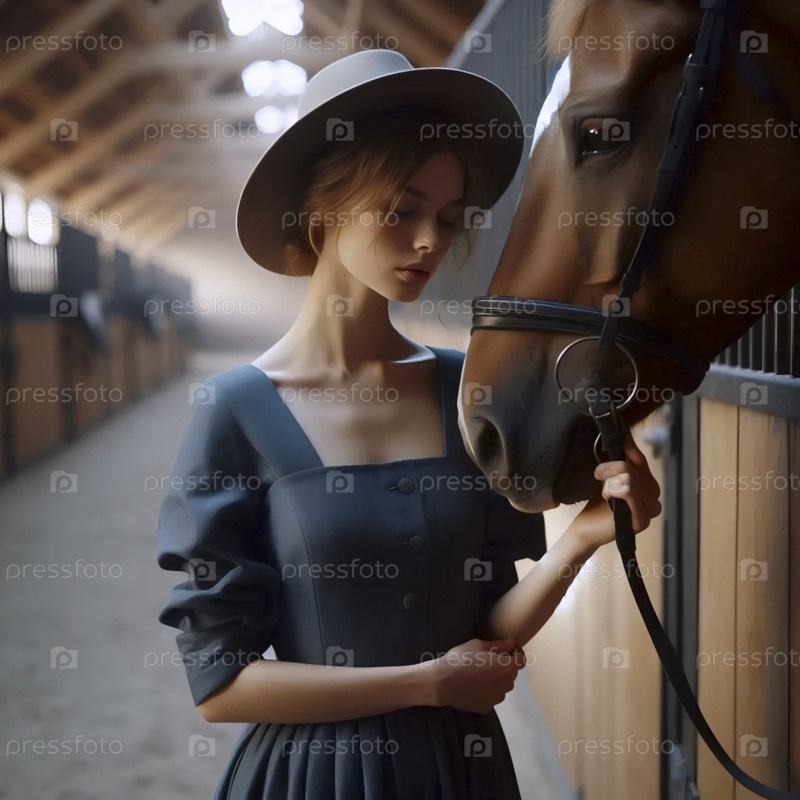 Женщина тренирует лошадь в джинсовом платье, Ai generated image