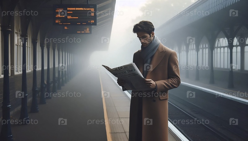 Мужчина в пальто-поло на туманной железнодорожной платформе, Ai generated image