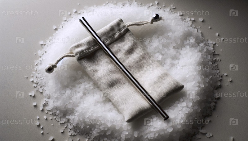 Макет трубки из нержавеющей стали, спрятанный внутри небольшого льняного мешка с резьбой на веревке, на кровати морской соли, Ай создал изображение