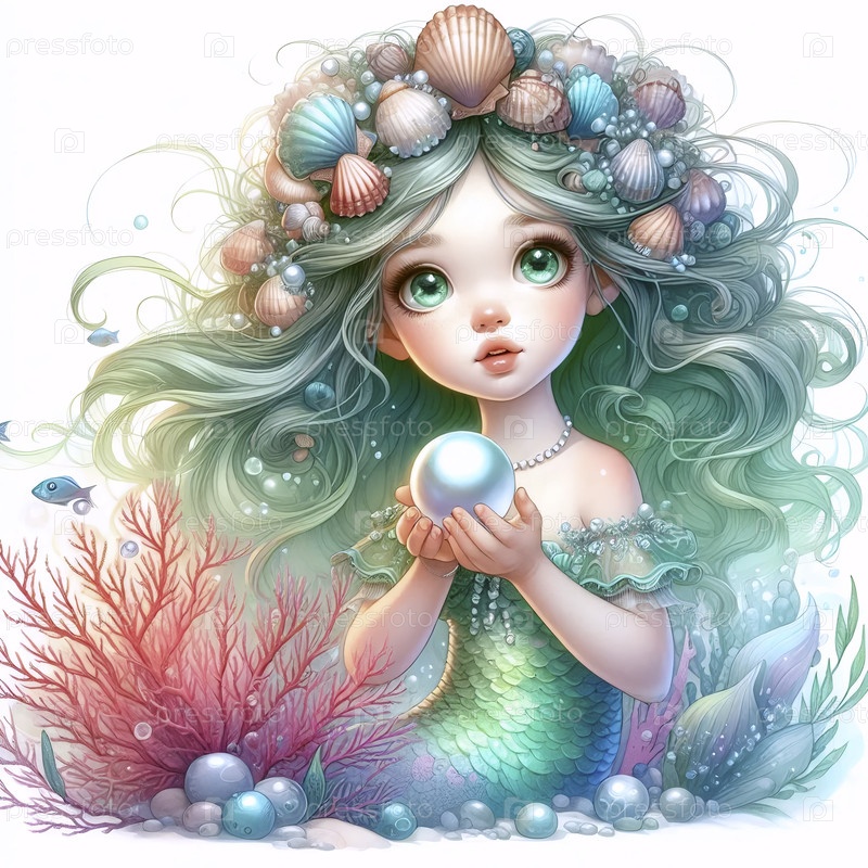 Любопытная русалка с акварельным художественным принтом Shell, Ai generated image A