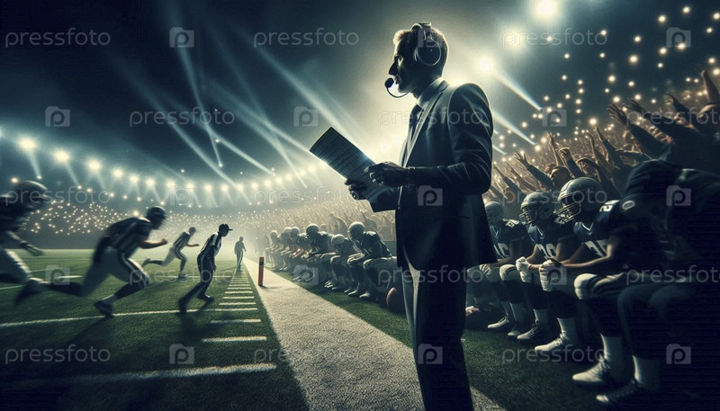 Более широкий кинематографический снимок окружающей среды, сделанный на хаотичной боковой линии стадиона во время финальной игры, Ai создал изображение