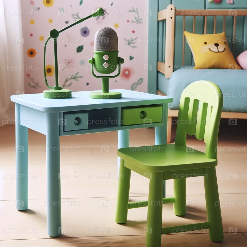 Небольшой красочный макет рабочего стола со встроенными шкафами для хранения и крошечным пустым микрофоном на низком стенде, в игровой комнате Ai создал изображение